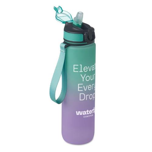 Sportowa butelka na wodę z RPET ze zintegrowaną słomką, miękkim silikonowym ustnikiem, motywacyjnym oznaczeniem czasu, otwieraną jedną ręką klapką, blokadą bezpieczeństwa i paskiem do przenoszenia. Pojemność 1 l. Szczelna.