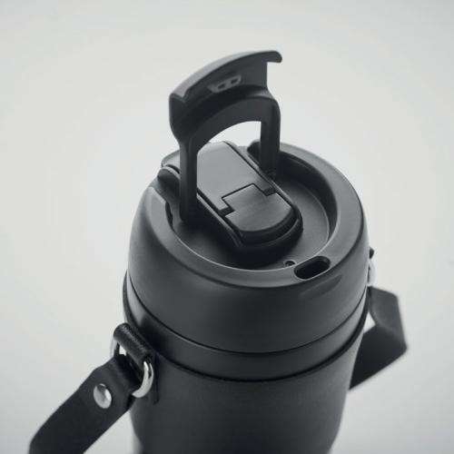 Dwuścienny, malowany proszkowo kubek ze stali nierdzewnej z pokrywką z PP 2 w 1 i paskiem z PU. Szczelny. Pojemność: 700 ml.