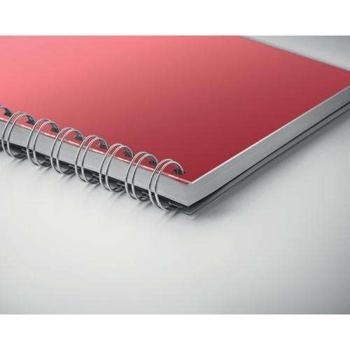 Notatnik A5 z okładką RPET. Podwójna spirala. 160 białych stron w linie pochodzących z recyklingu (80 kartek). Wymiary produktu: 14X21CM Materiał: Papier z Recyklingu
