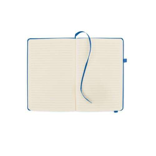 Notatnik A5 z okładką wykonaną w 70% ze skóry pochodzącej z recyklingu i w 30% z lateksowego PU. Obwoluta. 192 stron w linie na papierze z recyklingu (96 arkuszy). Dopasowany elastyczny bawełniany pasek i uchwyt na długopis.