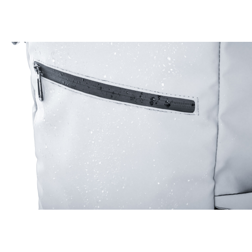 Wodoodporny plecak zwijany z RPET z klamrą i zapięciem na rzep, wyściełaną przegrodą na laptop (16″) i tablet (10″). Przednia kieszeń zapinana na zamek. Posiada kieszenie boczne, wyściełane plecy i paski na ramiona. Poliester 600D RPET powlekany PU, z charakterystyczną metką RPET.