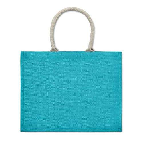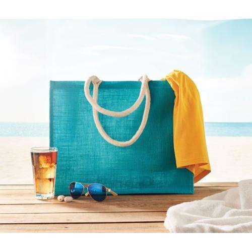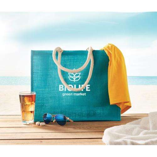 Laminowana jutowa torba plażowa lub na zakupy z bawełnianym uchwytem. Krótkie uchwyty.