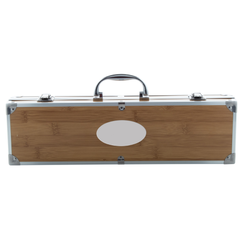 Zestaw do grilla ze stali nierdzewnej i bambusa (widelec, szczypce i łopatka z otwieraczem do butelek). W walizce aluminiowej z bambusowym wzorem.
