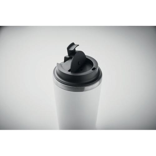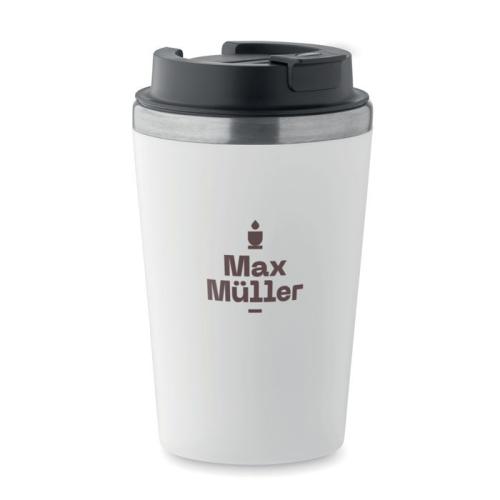 Kubek z podwójną ścianką. Zewnętrzna z PP i wewnętrzna ze stali nierdzewnej z recyklingu (90% stali nierdzewnej z recyklingu i 10% stali nierdzewnej) z ceramiczną powłoką wewnętrzną. Nie przecieka. Pojemność: 350 ml.