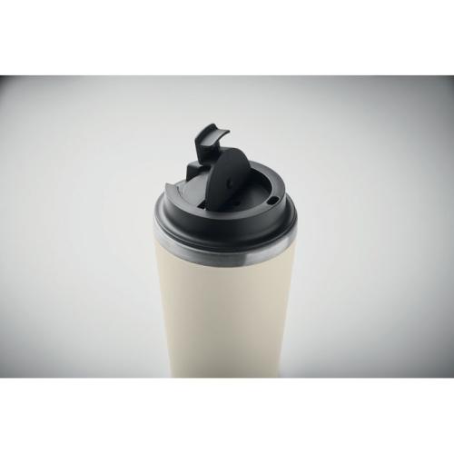 Kubek z podwójną ścianką. Zewnętrzna z PP i wewnętrzna ze stali nierdzewnej z recyklingu (90% stali nierdzewnej z recyklingu i 10% stali nierdzewnej) z ceramiczną powłoką wewnętrzną. Nie przecieka. Pojemność: 350 ml.