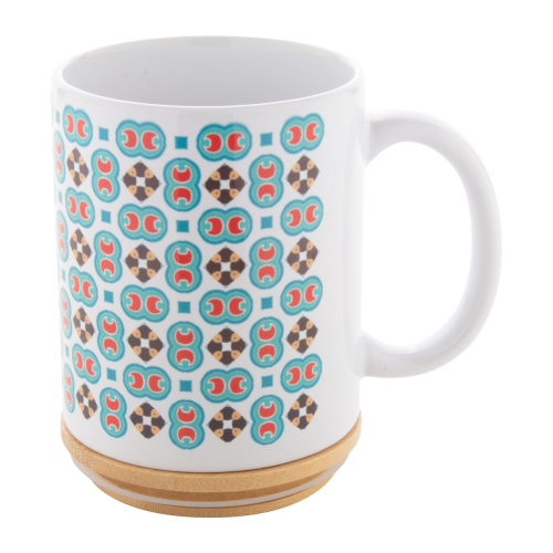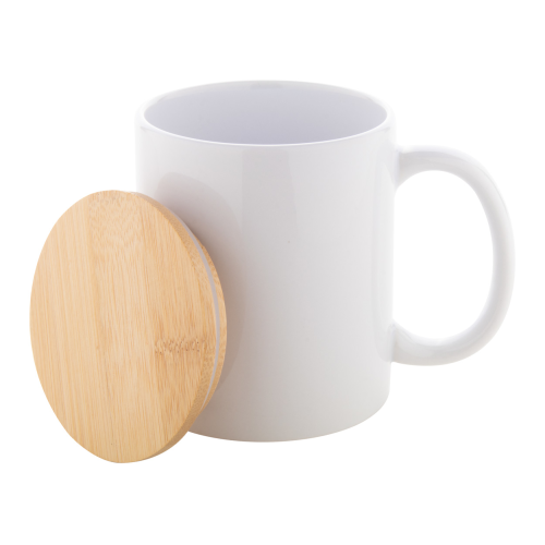 Biały kubek ceramiczny z bambusową pokrywką do nadruku sublimacyjnego, można myć w zmywarce, pojemność 300 ml. W pudełku z papieru kraft.