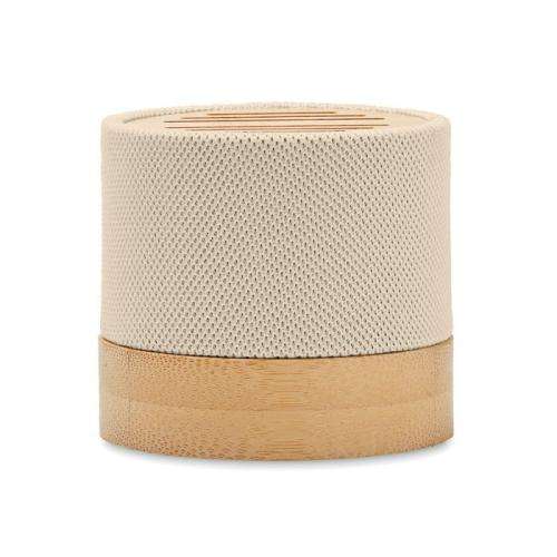 Głośnik bezprzewodowy 5.0 z RPET z bambusowym elementem. Sygnalizacja LED. 1 Akumulator Li-ION 300 mAh. Zawiera port kart SD oraz kabel AUX/USB. Wyjście: 3W, 3 Ohm i 5V. Czas odtwarzania ok. 3h. Bambus jest produktem naturalnym, dlatego mogą wystąpić nieznaczne różnice w kolorze, wzorze i rozmiarze. Wymiary produktu: Ø6,1X5,3 CM Materiał: Inne