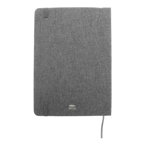 Notes pokryty poliestrem RPET z bambusową wkładką i podstawą na telefon. Z 80 kartkami w linie z papieru recykling, zakładką i gumowym paskiem. Rozmiar A5.