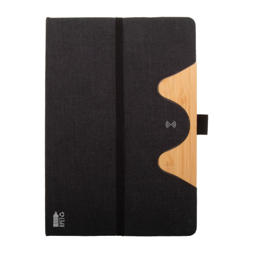 Notes z okładką z poliestru RPET, z wkładką bambusową, funkcją uchwytu na telefon i wbudowaną szybką ładowarką indukcyjną (15W). Zawiera 80 kartek w linie z papieru makulaturowego. Rozmiar A5. W zestawie kabel do ładowarki USB.