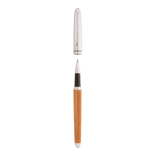Elegancki, bambusowo-metalowy zestaw składający się z długopisu i pióra kulkowego w bambusowym etui. Z niebieskim wkładem.