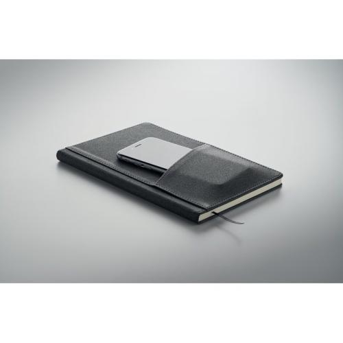 Notatnik A5 w twardej okładce z PU z kieszenią na telefon z przodu. Obwoluta. 160 stron w linie (80 kartek) z papieru z recyklingu. Dopasowana zakładka wstążkowa.