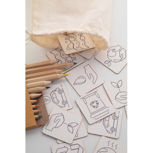 Gra memory do kolorowania w bawełnianym etui. Zawiera tematyczną tekturową grę memory (24 płytki) i drewniane kredki (12 sztuk) w papierowym pudełku.