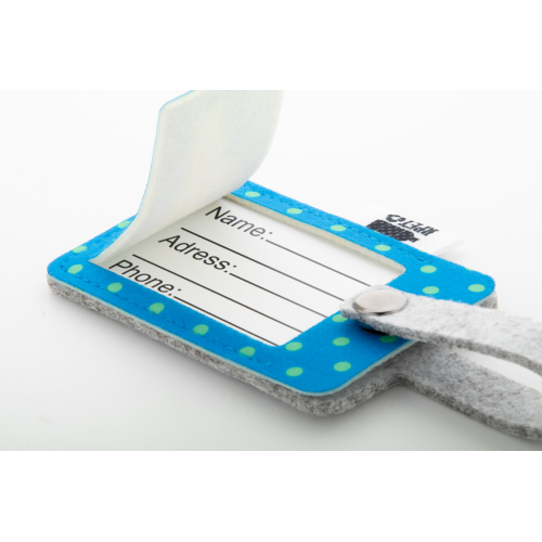 CreaFelt Tag. Personalizowana przywieszka bagażowa RPET AP716679. Personalizowana, filcowa zawieszka bagażowa RPET z full kolorowym nadrukiem z przodu, zapięciem na zatrzask i papierową wkładką. Z charakterystyczną metką RPET. Cena zawiera nadruk sublimacyjny. Min. Ilość: 50 szt.