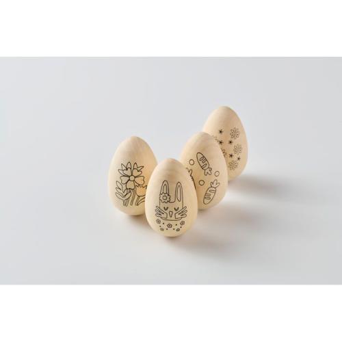 Zestaw do malowania 4 drewnianych pisanek z 4 pigmentami na bazie wody i 1 pędzlem w kartonowym pudełku.