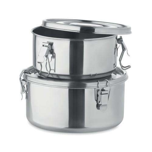 Zestaw lunch boxów lub pojemników ze stali nierdzewnej z mocnymi i bezpiecznymi klamrami bocznymi. Pojemność: 450 ml. i 900 ml.