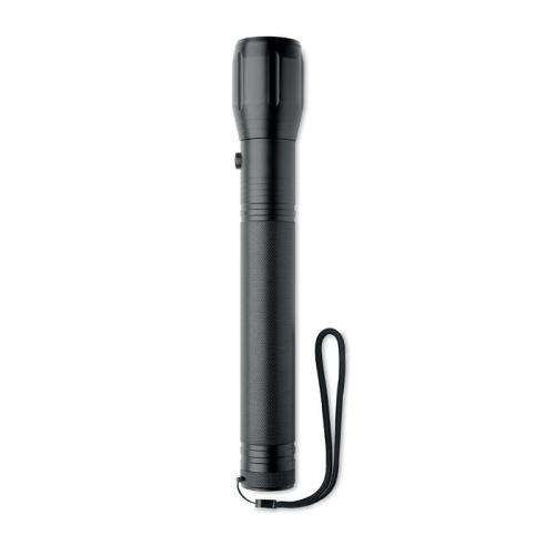 Duża aluminiowa latarka z 1 diodą LED, z możliwością powiększenia i z odczepianym paskiem. Moc światła: 300 lumenów. 3 baterie D nie są dołączone.