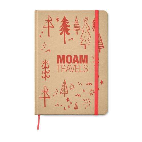 Notatnik A5 z twardą okładką z kartonu pochodzącego z recyklingu. Oprawiony w pudełko. 160 stron w linie (80 kartek). Elastyczny pasek zamykający, zakładka ze wstążki.