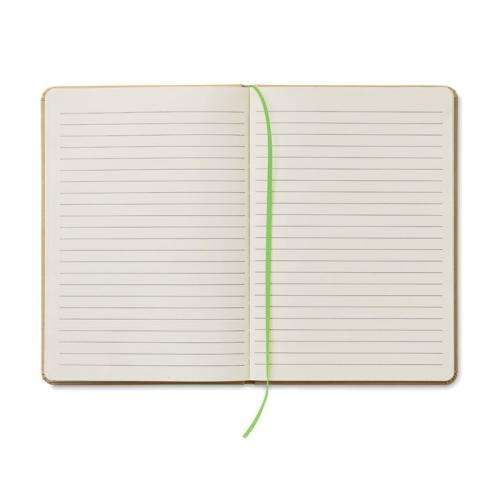 Notatnik A5 z twardą okładką z kartonu pochodzącego z recyklingu. Oprawiony w pudełko. 160 stron w linie (80 kartek). Elastyczny pasek zamykający, zakładka ze wstążki.