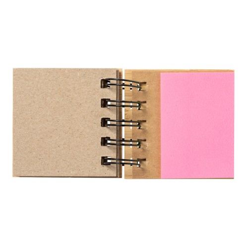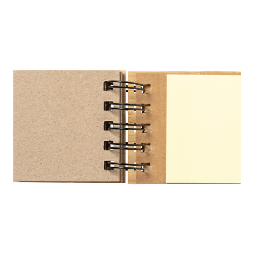 Spiralny notes z okładką bambusową z 75 dużymi karteczkami (w 3 różnych kolorach) i 125 małymi karteczkami samoprzylepnymi (w 5 różnych kolorach).