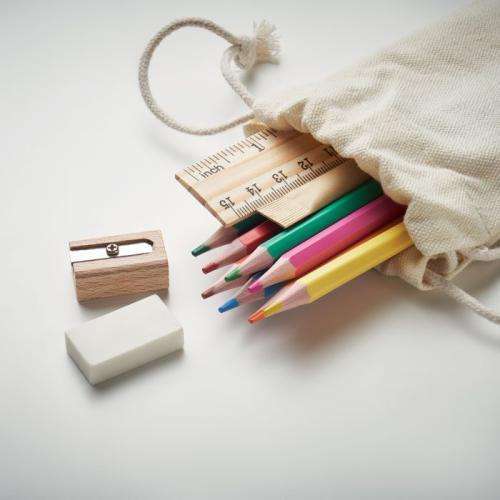 Zestaw przyborów do rysowania dla dzieci, składający się z 5 elementów, w tym drewnianej linijki, temperówki, gumki, drewnianego ołówka i długopisu. Dodatkowo 10 kredek do kolorowania, papier A4 z recyklingu, 50 gładkich kartek (100 stron). Zestaw zapakowany w bawełnianą torbę ze sznurkiem.