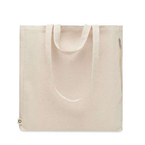 Torba zakupowa lub plażowa z polibawełny z recyklingu (70% bawełna z recyklingu, 30% poliester z recyklingu) z krótkimi i długimi uchwytami. Posiada boczną kieszeń na zamek błyskawiczny, 380 gr/m².