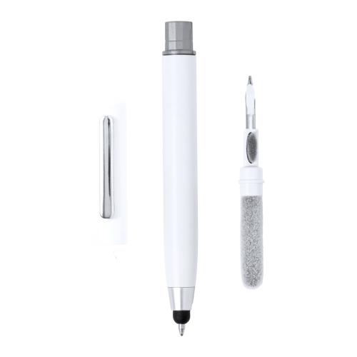 Przekręcany długopis z tworzywa ABS i z końcówką do ekranów dotykowych z wbudowanym zestawem do czyszczenia słuchawek. Z niebieskim wkładem.