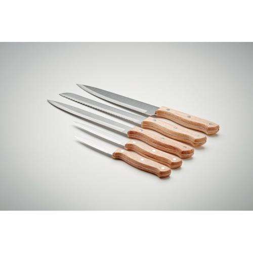 Drewniany zestaw noży ze stojakiem i 5 różnymi nożami: nóż szefa kuchni, nóż do chleba, do plastrowania, obieraczka i uniwersalny nóż kuchenny. Stal nierdzewna z drewnianą rączką.