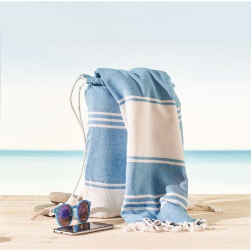 Zestaw z ręcznikiem plażowym hammam z workiem ze sznurkiem. 70% bawełna z recyklingu i 30% poliester z recyklingu 180 gr/m². 90×160 cm.