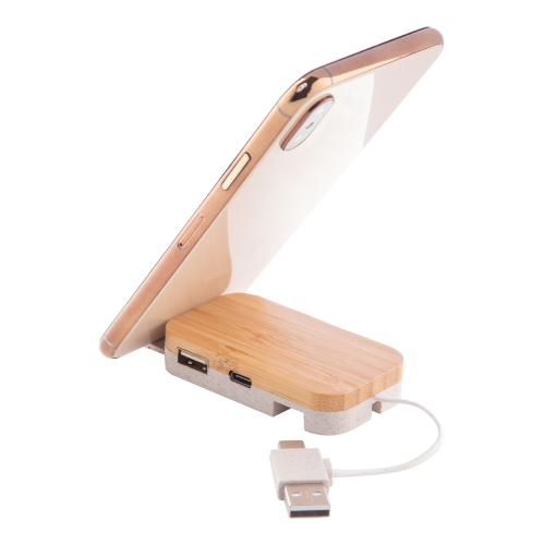 Hub USB z bambusa i ekologicznej słomy pszenicznej z funkcją uchwytu na telefon. Z 2 portami USB i 2 portami USB-C, USB 2.0. Zawiera kabel ze złączami USB i USB-C.