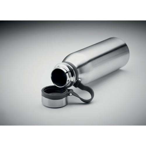 Dwuścienna butelka ze stali nierdzewnej z silikonowym uchwytem do łatwego przenoszenia. Bez BPA. Szczelna. Pojemność: 600 ml.