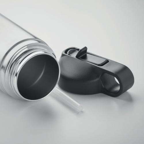 Izolowana próżniowo butelka z podwójnymi ściankami ze stali nierdzewnej z recyklingu (90% ze stali nierdzewnej z recyklingu i 10% ze stali nierdzewnej) z pokrywką z PP i wbudowaną słomką. Szczelna. Pojemność: 500 ml.