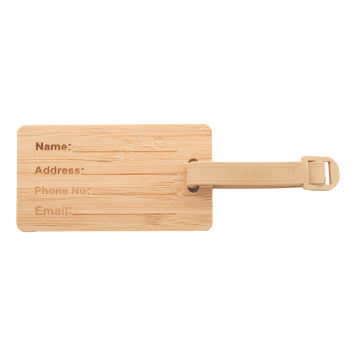 Bambusowa zawieszka bagażowa z plastikowym paskiem i klamrą.