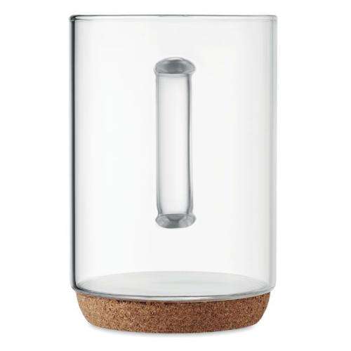 Kubek z borokrzemowego szkła z korkową podstawą. Pojemność: 400 ml. Korek jest materiałem w 100% naturalnym. Ze względu na jego strukturę i porowatość powierzchni ostateczny wygląd nadruku na każdym artykule może się różnić. Wymiary produktu: Ø8X11,7 CM Materiał: Szkło Borosilikatowe