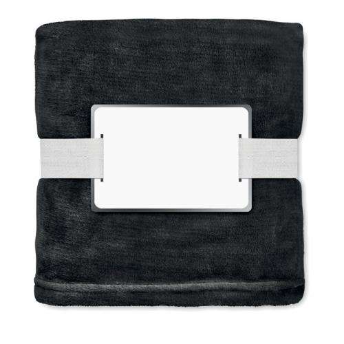 Koc z flaneli RPET 280 gr/m² ze wstążką i etykietą do nadruku.