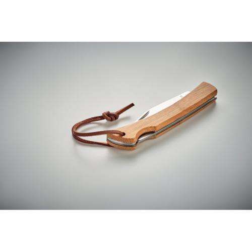 Składany nóż ze stali nierdzewnej 2CR13 i bambusową rękojeścią, ze sznurkiem PU. Bambus jest produktem naturalnym, dlatego mogą wystąpić nieznaczne różnice w kolorze, wzorze i rozmiarze.