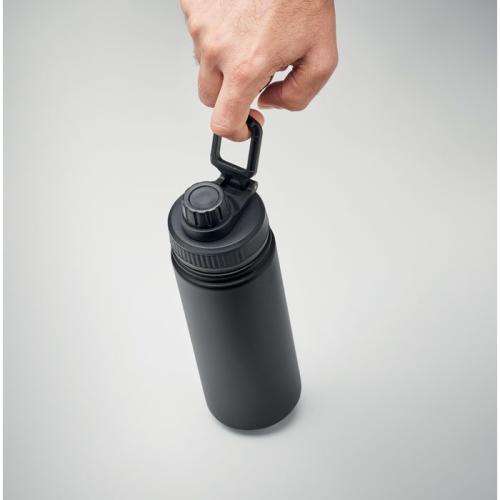 Butelka z podwójną ścianką ze stali nierdzewnej, izolowana próżniowo, z korkiem w zakrętce i uchwytem do przenoszenia. Pojemność: 500 ml.