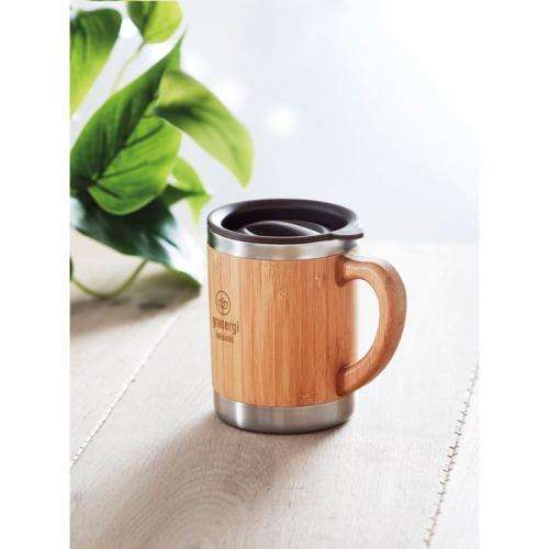 Kubek ze stali nierdzewnej z podwójnymi ściankami, bambusowa obudowa i obrotowy otwór do picia. Pojemność 300 ml. Bambus jest produktem naturalnym, dlatego mogą wystąpić nieznaczne różnice w kolorze, wzorze i rozmiarze.