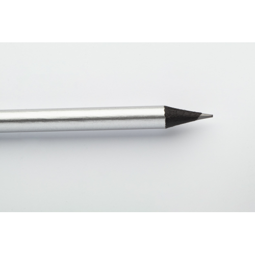 Ołówek z czarnego drewna w metalicznym wykończeniem, z czarną gumką. Zatemperowany, klasa HB.