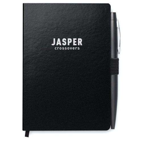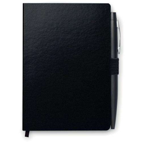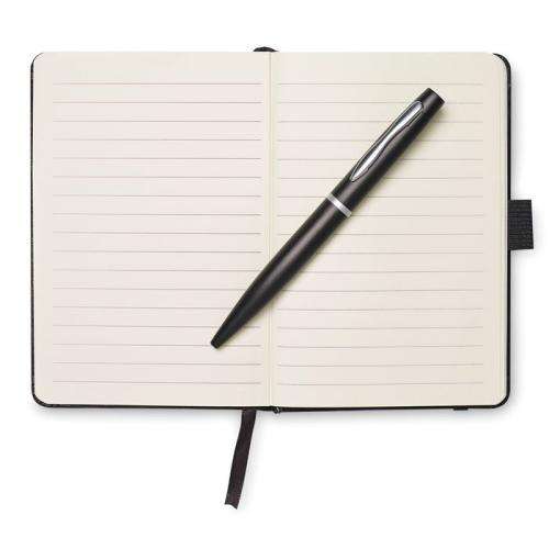 Notes A6 z długopisem. Twarda okładka z PU. 144 strony w linie (72 kartki). Dopasowany elastyczny pasek zamykający i uchwyt na długopis. Dopasowany metalowy długopis z przyciskiem. Niebieski tusz.