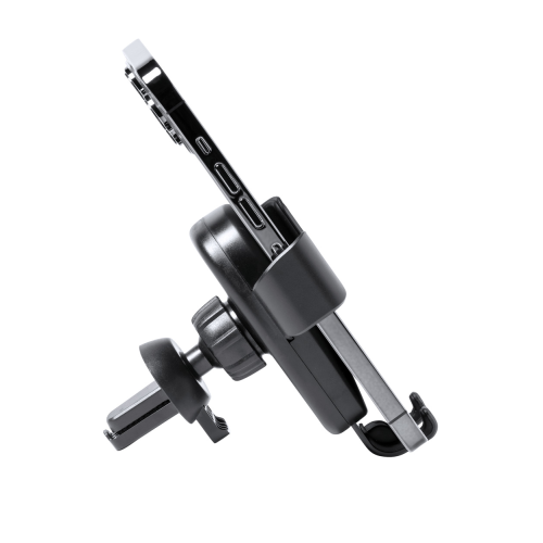 Samochodowy uchwyt na telefon z tworzywa ABS z wbudowaną szybką ładowarką indukcyjną (10W) i regulowanym mocowaniem na kratkę wentylacyjną. W zestawie kabel do ładowarki USB.