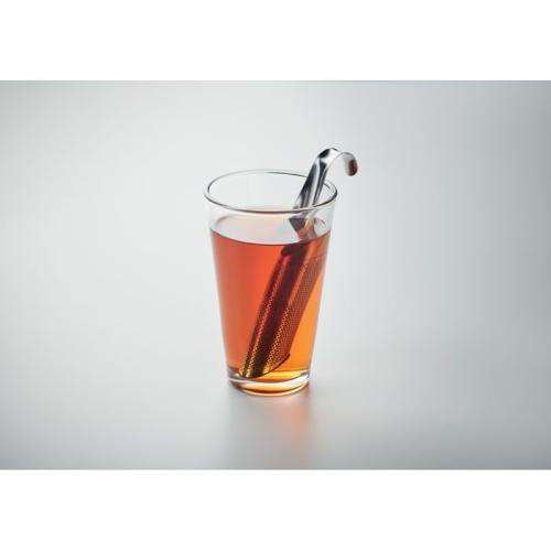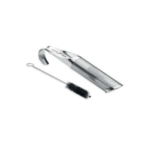 Zestaw wielokrotnego użytku z zaparzaczem do herbaty ze stali nierdzewnej w bawełnianym etui. W zestawie zaparzacz do herbaty z kompaktowym i zakrzywionym haczykiem, który umożliwia zawieszenie go nad krawędzią filiżanki lub kubka, oraz szczoteczka do czyszczenia.