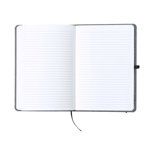 Notes z okładką z poliestru 600D RPET, 100 kartek w linie, zakładką i gumką. Rozmiar A5.