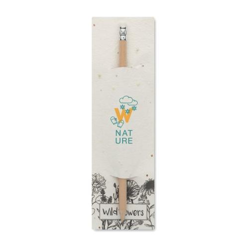 Ołówek z naturalnego drewna z gumką. Zapakowany w saszetkę z papieru siewnego (polne kwiaty). Wymiary produktu: 19,7X6X0,8 CM Materiał: Drewno