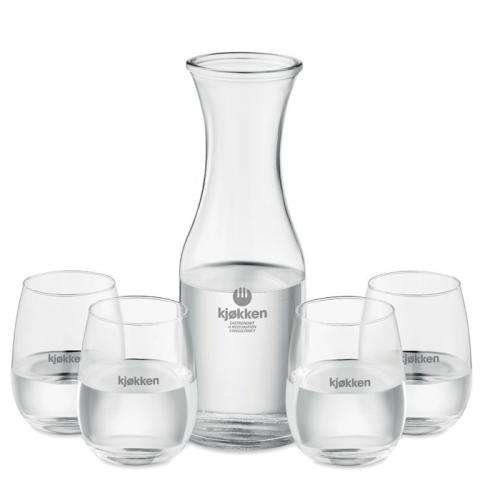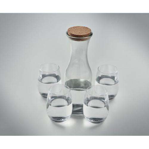 Zestaw do napojów wykonany ze szkła pochodzącego z recyklingu. W skład zestawu wchodzi: Karafka (1L) z korkową pokrywką i 4 szklanki (420 ml). Korek jest materiałem w 100% naturalnym. Ze względu na jego strukturę i porowatość powierzchni ostateczny wygląd nadruku na każdym artykule może się różnić.