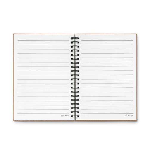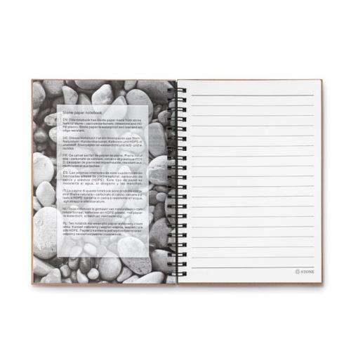 Notatnik z okładką z kartonu z recyklingu. Podwójna spirala. 140 stron w linie z papieru mineralnego (70 arkuszy). Papier mineralny jest wykonany z węglanu wapnia i HDPE (żywicy polietylenowej) stosowanej jako spoiwo. Jest wodoodporny i odporny na tłuszcz.