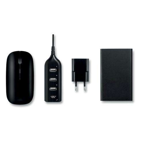 Akcesoria komputerowe w etui EVA/PU, które zawiera: 1 mysz bezprzewodową, 4-portowy hub USB 2.0, 1 wtyczkę EU i power bank 4000 mAh. W zestawie kabel micro USB do ładowania. Wymiary produktu: 14X14X4,7 CM Materiał: ABS