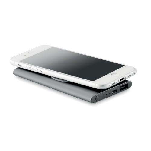 Bezprzewodowy, aluminiowy power bank o pojemności 4000 mAh. Zawiera złącze typu C. Wyjście: DC5V/0.8A. Kompatybilny z najnowszymi androidami, iPhone® 8, 8S i X i nowszymi.
