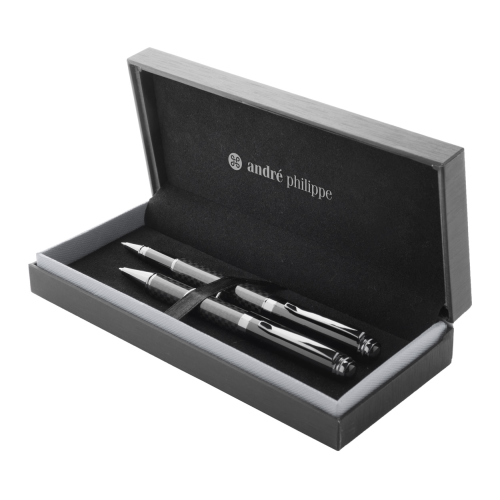 Elegancki zestaw: metalowy długopis i pióro kulkowe z wykończeniem na wzór karbonowego. W czarnym opakowaniu, z niebieskim wkładem. Produkt marki Andre Philippe.