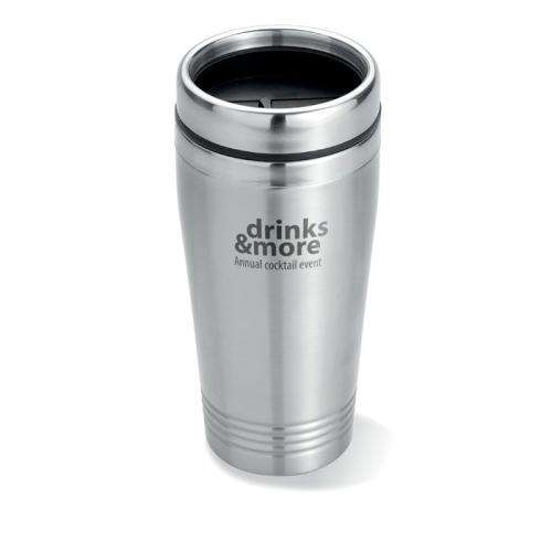 Kubek podróżny ze stali nierdzewnej o podwójnych ściankach, z czarną pokrywką z PP. Pojemność: 400 ml.