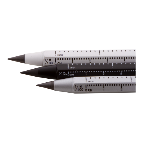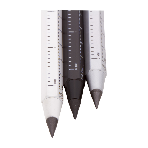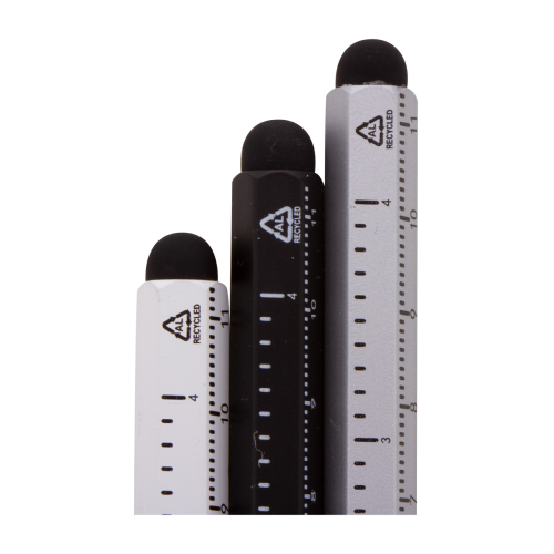 Bezatramentowy długopis z aluminium pochodzącego z recyklingu z końcówką do ekranów dotykowych i końcówką piszącą ze stopu metalu, który utlenia papier. Z sześciokątnym korpusem zawierającym linijki 11 cm i 4 cale. Ten długopis pisze podobnie do ołówka, a także można go wymazywać.